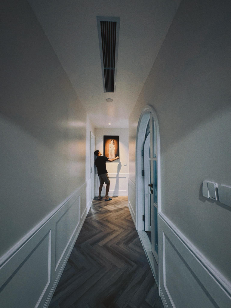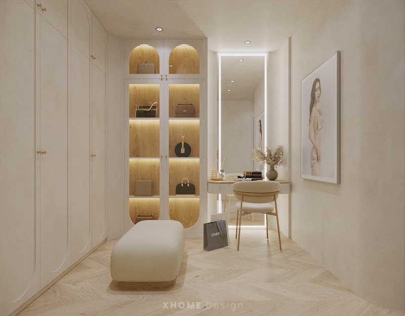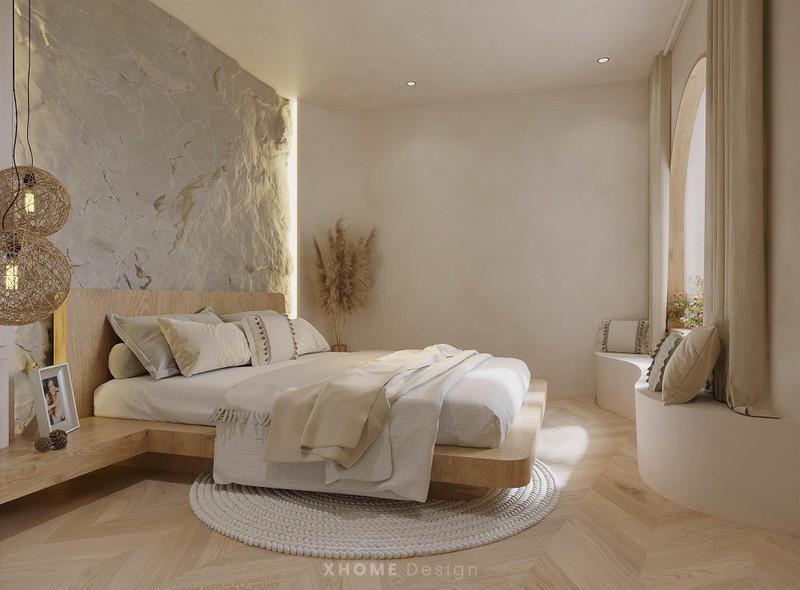 Huyền Lizzie chia sẻ cô muốn không gian căn nhà mới sẽ thoáng đãng, có các góc giống studio chụp hình để tạo cảm giác chill, tươi mới. Bởi vậy, từng nội thất như tủ âm tường, giường, bàn ghế đều được cô lựa chọn kĩ lưỡng. Phòng ngủ được cô thiết kế đèn vàng chìm trong tường tạo cảm giác thoải mái, ấm cúng. Đèn thả trần với ánh sáng dịu nhẹ, thư giãn chủ nhân căn nhà