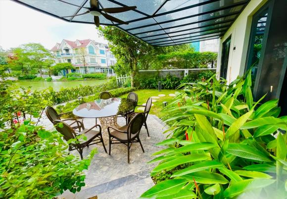 Không gian tuyệt nhất của căn biệt thự là phần sân sau rộng, có mái che hiện đại với view nhìn ra hồ. Lã Thanh Huyền tinh tế bố trí bàn ghế để gia đình có thể sum họp tại đây, vừa gần gũi thiên nhiên, vừa ngắm cảnh