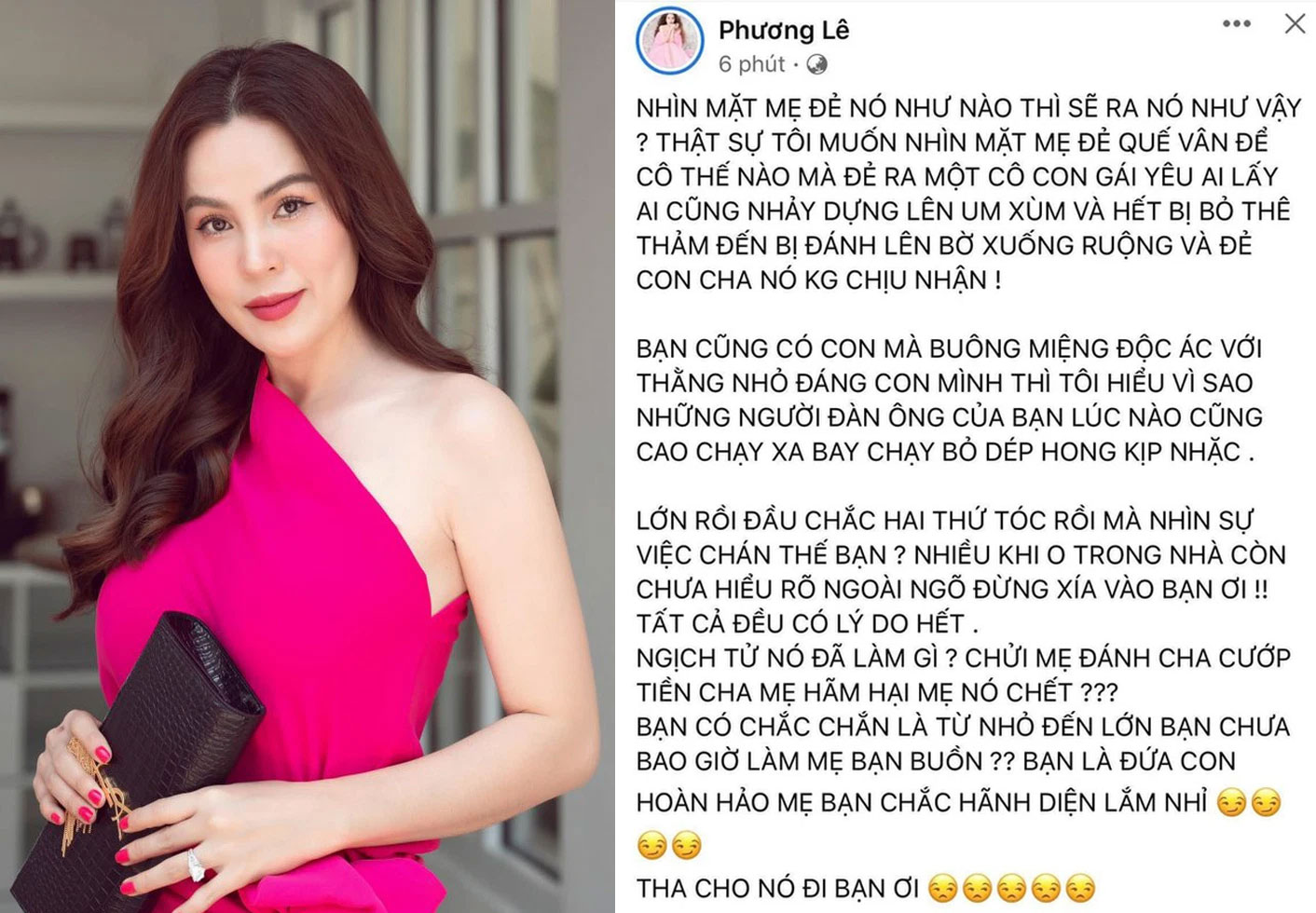 Trước phát ngôn của Quế Vân, Hoa hậu Phương Lê đã vô cùng bức xúc. Cô công khai chỉ trích cựu người mẫu trên trang cá nhân: "Bạn cũng có con mà buông miệng độc ác với thằng nhỏ đáng con mình thì tôi hiểu vì sao những người đàn ông của bạn lúc nào cũng cao chạy xa bay, bỏ dép không kịp nhặt. Lớn rồi đầu chắc hai thứ tóc mà nhìn sự việc chán thế bạn? Nhiều khi ở trong nhà còn chưa hiểu rõ, ngoài ngõ đừng xía vào bạn ơi! Tất cả đều có lý do hết".