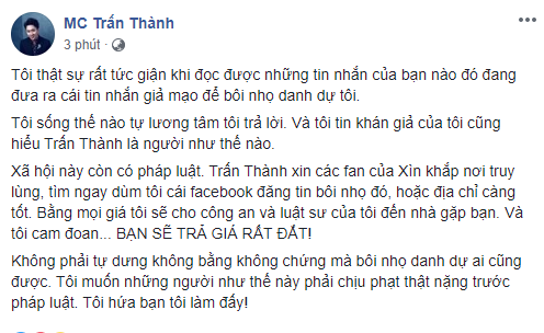 Trấn Thành viết: "Tôi thật sự rất tức giận khi đọc được những tin nhắn của bạn nào đó đang đưa ra cái tin nhắn giả mạo để bôi nhọ danh dự tôi.