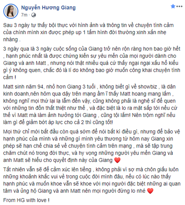 Cách đây không lâu, Hương Giang từng thu hút đông đảo sự chú ý khi cho biết sau hàng loạt lùm xùm khiến cuộc sống của cả hai xáo trộn, nữ ca sĩ và Matt Liu quyết định sẽ hạn chế chia sẻ chuyện tình cảm trên mạng, tập trung chăm chút tình yêu ngoài đời thay vì trên MXH. Cặp đôi hy vọng người hâm mộ sẽ hiểu cho quyết định này.