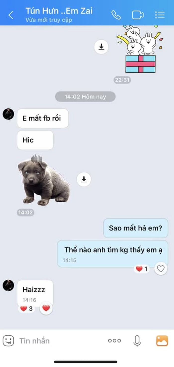 Giọng ca Tình em là đại dương không giấu khỏi sự bức xúc: "Ai hack lấy mất Facebook của em trai tôi. Trả lại Facebook cho em trai tôi mau. Đừng để tôi đi tìm tận nơi nhé!". Trong hình ảnh chụp màn hình đoạn tin nhắn, Tuấn Hưng buồn bã cho biết: "Em mất Facebook rồi, hic". Duy Mạnh nhanh chóng đáp lại: "Sao mất hả em? Thể nào anh tìm không thấy em ạ".