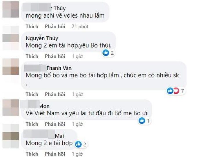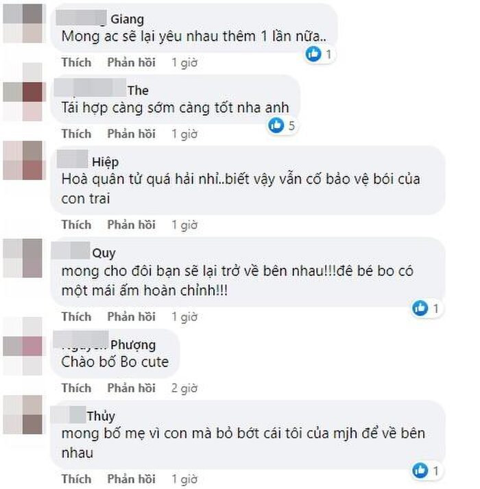 Bên cạnh những lời hỏi thăm, không ít cư dân mạng lại bày tỏ mong muốn Minh Hải tái hợp cùng Hoà Minzy để tiếp tục xây dựng gia đình hạnh phúc, cùng nuôi dạy bé Bo.