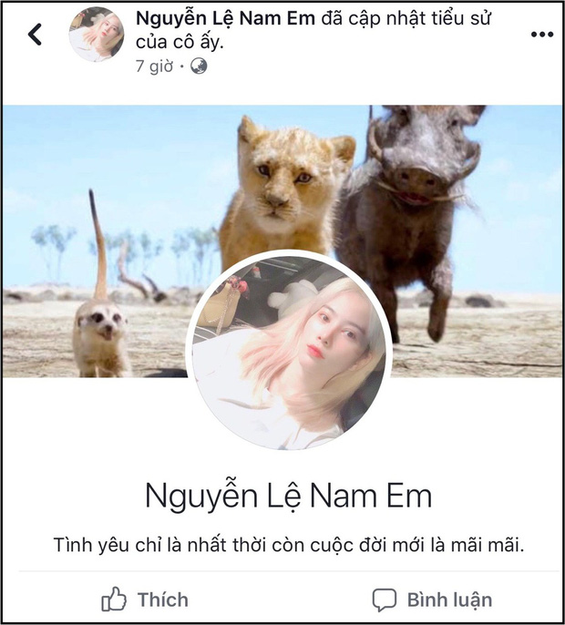 Cho tới mới đây, Nam Em lại lọt vào tầm chú ý của dân mạng khi bất ngờ cập nhật tiểu sử cá nhân trên Facebook bằng câu: "Tình yêu chỉ là nhất thời còn cuộc đời mới là mãi mãi". Điều này đã làm đông đảo khán giả vô cùng hoang mang, khó hiểu, nhất là khi vài ngày trước, Nam Em còn đăng một clip khóc nức nở lên trang cá nhân, chứng minh tâm trạng bất ổn.