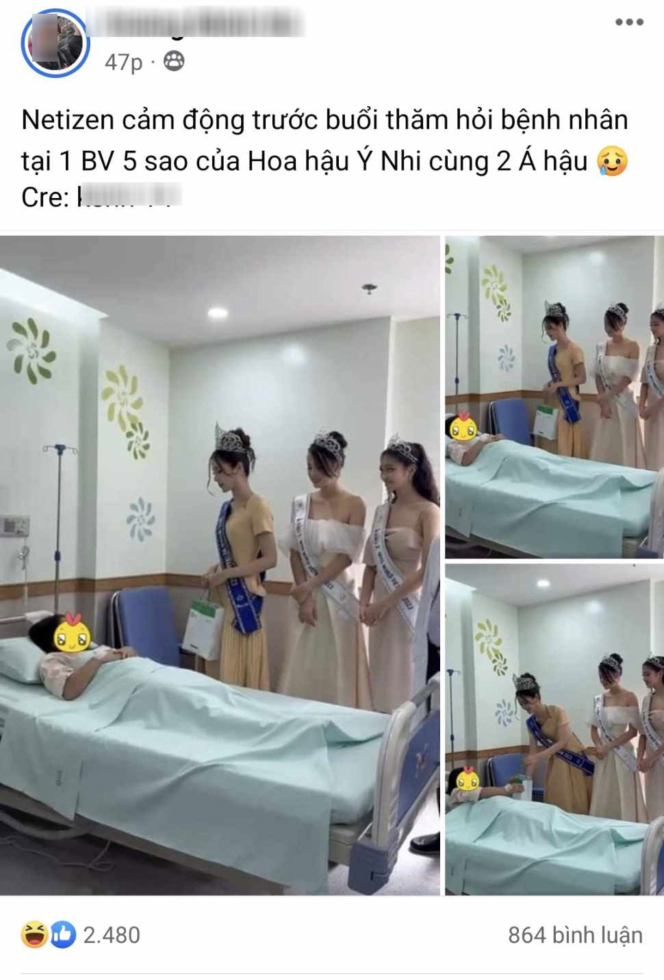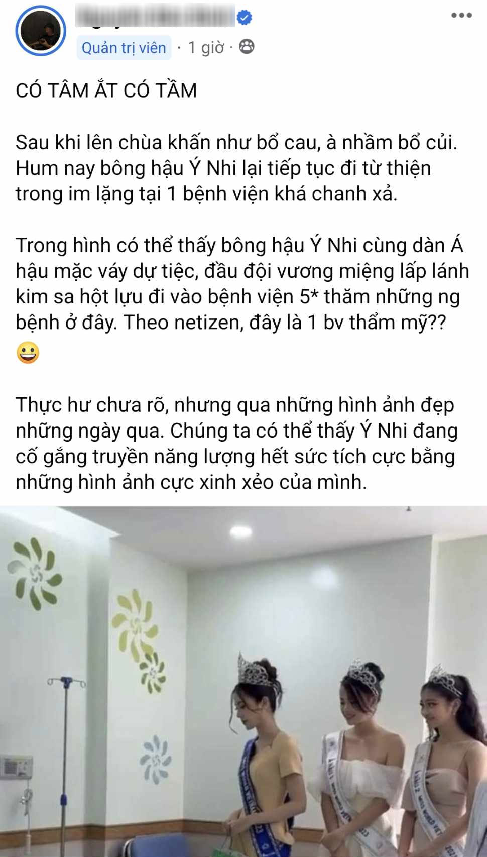 Tuy nhiên, điều đáng nói, thay vì ăn mặc giản dị như nhiều mỹ nhân khác, Ý Nhi cùng 2 Á hậu Đào Hiền, Minh Kiên lại diện váy dạ hội cầu kỳ, đi giày cao gót, thậm chí còn đội cả vương miện và sash giống như đi sự kiện. Bên cạnh đó, bệnh viện mà Top 3 Miss World Vietnam 2023 đến thăm và trao quà cũng được cho là một bệnh viện thẩm mỹ 5 sao. Điều này càng khiến cư dân mạng có thêm lý do để chỉ trích Ý Nhi và 2 Á hậu.