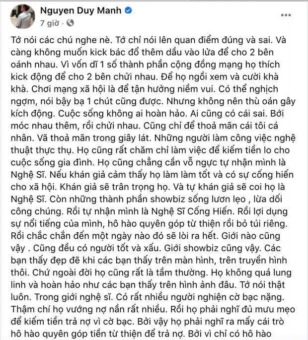 1 ngày giữa tuần nhưng sáng ra dân tình đã "hít drama" vì rầm rộ tin nhắn với loạt thông tin gây sốc của Hồ Văn Cường về gia đình. Sau đó, Duy Mạnh cũng góp phần vào "vựa biến" khi đăng status dài hé lộ nhiều cái xấu, mặt trái của nghệ sĩ và còn ẩn ý ai đó lợi dụng danh tiếng kêu gọi từ thiện để kiếm tiền trả nợ bài bạc,... Chia sẻ của Duy Mạnh dù chưa xác thực được đúng sai và chỉ mang tính cá nhân nhưng cũng khiến khán giả hoang mang cực độ.