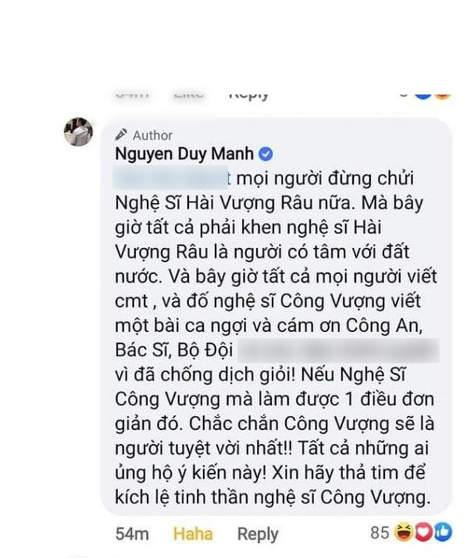 Đáng nói, bên dưới bài viết của Duy Mạnh, Vượng Râu là nghệ sĩ hiếm hoi trực tiếp vào hẳn bài đăng để lại bình luận góp ý về quan điểm của đồng nghiệp. Nói cụ thể hơn, Vượng Râu không tán thành chuyện Duy Mạnh bắt ép người khác phải theo quan điểm hay suy nghĩ cá nhân của anh: "Mỗi Facebook là 1 ngôi nhà, ai hợp thì vào xin miếng nước không hợp thì bước trong chiều mưa. Quan điểm của mỗi người đều khác nhau, sao nhiều người cứ ép người khác theo ý mình mới chịu nhỉ".