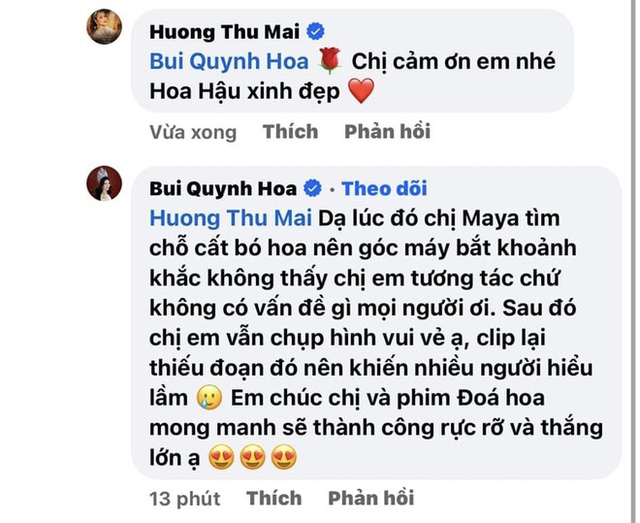 Kèm theo đó, Maya còn đăng tải bình luận lên tiếng từ phía Hoa hậu Bùi Quỳnh Hoa. Nàng hậu 9x cho biết lúc đó Maya tìm chỗ cất bó hoa, góc máy bắt đúng khoảnh khắc hai chị em không thấy có tương tác. "Không có vấn đề gì mọi người ơi. Sau đó hai chị em vẫn vui vẻ chụp hình ạ. Clip lại thiếu đoạn đó nên mọi người hiểu lầm", người đẹp cho hay.