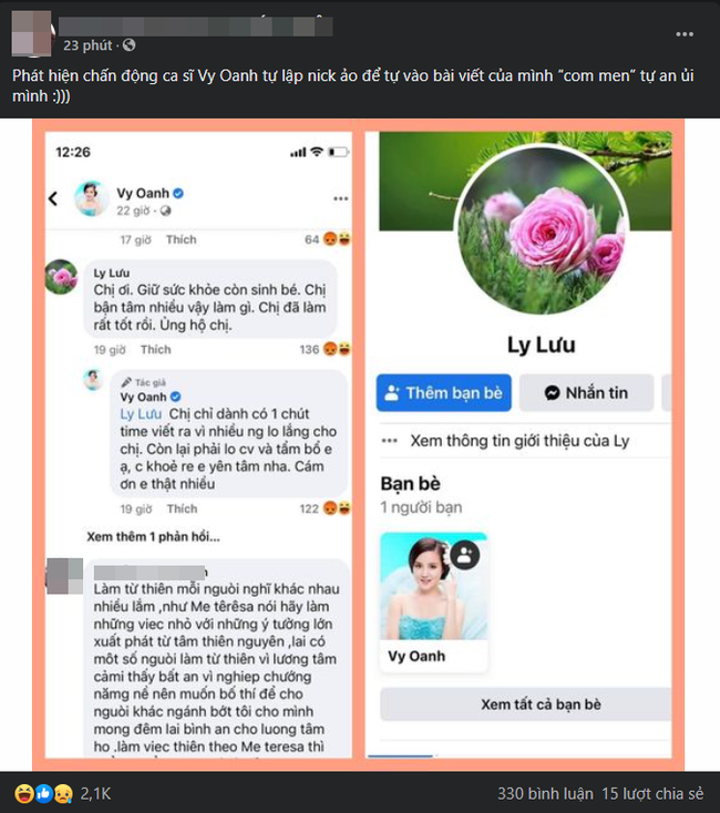 Cụ thể, cư dân mạng phát hiện một tài khoản Facebook tên là Ly Lưu đã để lại bình luận động viên, an ủi dưới bài đăng của Vy Oanh. Trang cá nhân này có kết bạn với Vy Oanh nhưng không có nhiều hình ảnh chụp người và các hoạt động đăng bài khiến nhiều người nghi ngờ nữ ca sĩ tự lập nick ảo để bình luận ủng hộ chính mình.