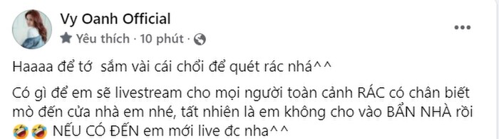 Nữ ca sĩ viết: "Để tớ sắm vài cái chổi để quét rác nhá. Có gì để em sẽ livestream cho mọi người toàn cảnh RÁC có chân biết mò đến cửa nhà em nhé, tất nhiên là em không cho vào BẨN NHÀ rồi. Nếu có đến em mới live được nha".