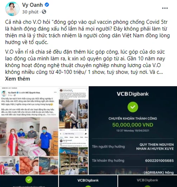 Trước những bình luận kém duyên từ một vài netizen thì mới đây nhất, trên tài khoản cá nhân, Vy Oanh đã đăng tải tâm thư kèm hàng loạt bản sao kê của những khoản tiền làm từ thiện từ trước đến giờ. Nữ ca sĩ mở đầu tâm thư bằng câu chất vấn: "Đóng góp vào quỹ Vaccine phòng chống Covid 5 triệu là hành động đáng xấu hổ lắm hả mọi người?". Tiếp tục, Vy Oanh hé lộ mức cát-xê 100 triệu và cho biết số tiền quyên góp do chính công sức của mình làm ra, không đi xin xỏ hay vận động ai nên cảm thấy không có gì đáng hổ thẹn.