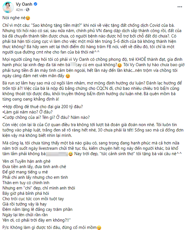 10/10/2021 22:05Vy Oanh gieo vần làm thơ mỉa 'ai đó' chỉ biết ngồi nói 'ảm nhảm', đánh lạc hướng dư luận để trốn tội