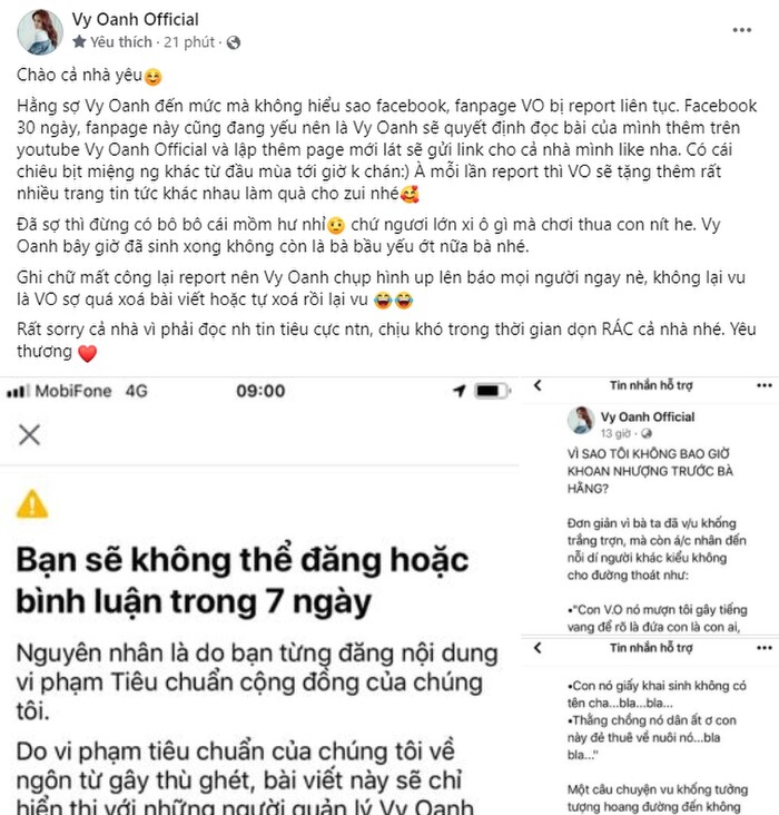 Sau khi chia sẻ những bài viết đáp trả nữ đại gia Bình Dương, Vy Oanh đã bị một bộ phận phá khóa trang cá nhân, đồng thời bài viết đấu tố với CEO Đại Nam cũng bị ai đó báo cáo xấu.