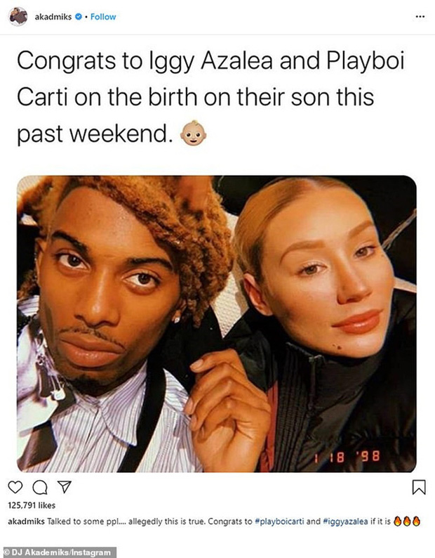Trước đó không lâu, nam DJ Akademiks bất ngờ đăng tải thông tin vui lên quan đến cặp đôi Iggy Azalea - Playboi Carti ngay trên trang Instagram cá nhân với 2,5 triệu người theo dõi. Nam DJ viết: "Xin chúc mừng cặp đôi Iggy Azalea và Playboi Carti vừa chào đón một bé trai chào đời vào cuối tuần vừa rồi. Tôi đã nói chuyện với một số người và họ đều khẳng định thông tin này là chính xác. Nếu quả thật như vậy thì xin chúc mừng hai bạn nhé".