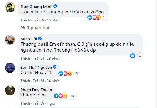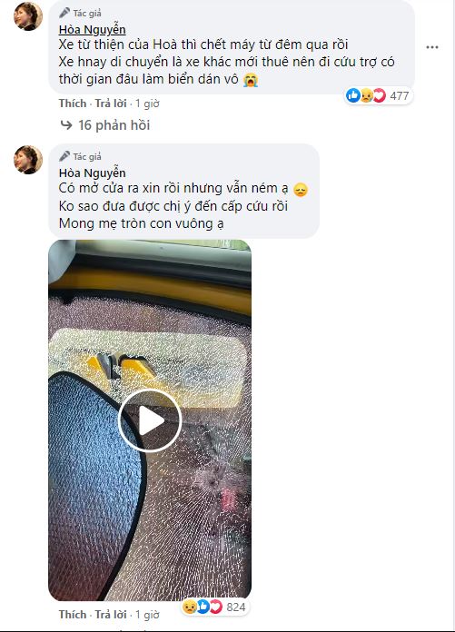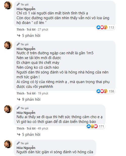 Dưới phần bình luận, Hòa Minzy cũng cung cấp thêm nhiều thông tin về tình hình cứu trợ bà con vùng lũ. Theo đó, khi nhận được nhiều ý kiến khuyên rằng đoàn của Hòa nên dán thêm băng rôn để mọi người biết đây là xe cứu trợ, nữ ca sĩ cho biết xe từ thiện của mình đã chết máy từ đêm qua, chiếc ô tô di chuyển hôm nay là xe khác mới thuê, vì gấp rút đi giúp đỡ bà con nên chưa có thời gian để làm biển dán vào.