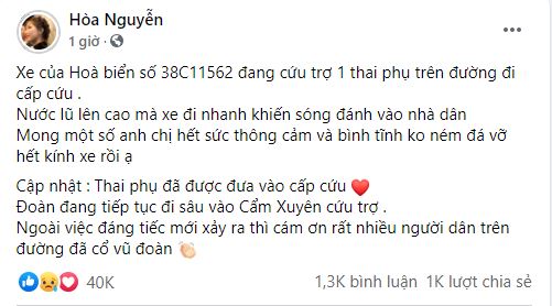 Cách đây ít phút, Hòa Minzy đã đăng lên trang cá nhân dòng thông báo khẩn về việc mong người dân đừng ném đá vào ô tô của mình vì đang chở sản phụ đi bệnh viện. Cô viết: "Xe của Hòa đang cứu trợ 1 thai phụ đang trên đường đi cấp cứu. Nước lũ lên cao nên xe đi sóng đánh vào nhà dân. Mong người dân bình tĩnh không ném đá vỡ hết kính xe rồi ạ. Ôi trời ơi xe đang cấp cứu ạ".