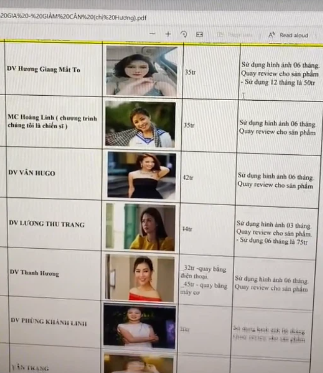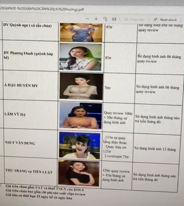 Theo nội dung trong bảng này, Thu Trang có giá cát xê quảng cáo cao nhất là 120 triệu đồng để quay review, mỗi tháng sử dụng hình ảnh phải trả thêm 45 triệu, Lâm Vỹ Dạ nằm ở mức 100 triệu đồng, NS Vân Dung là 115 triệu đồng nếu quay bằng điện thoại và 125 triệu đồng nếu quay bằng máy cơ, Á hậu Huyền My được cho là có mức cát xê 70 triệu đồng.... Mặc dù những thông tin này chưa được xác thực nhưng đã tạo nên một cuộc "khẩu chiến" rầm rộ trên MXH. Nhiều người cho rằng mức cát xê là chuyện tế nhị, ảnh hưởng đến công việc và cuộc sống của các nghệ sĩ. Tuy nhiên cũng có nhiều ý kiến nghi ngờ về độ xác thực của bảng giá này. Hiện tại, chúng tôi đang liên lạc với những nghệ sĩ xuất hiện tại đây để tìm hiểu rõ thực hư.