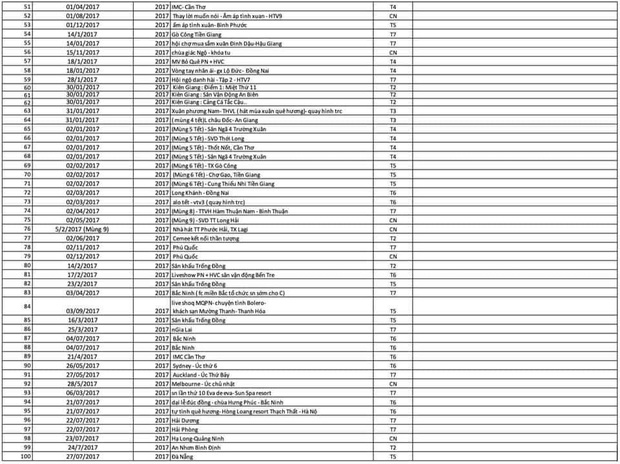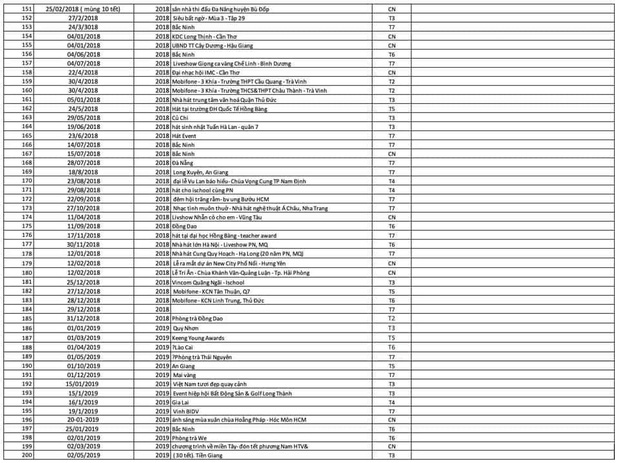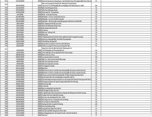 Trong danh sách 310 sự kiện của Hồ Văn Cường theo như ghi chép bên dưới bao gồm đêm diễn tại các chương trình âm nhạc, các chương trình truyền hình thực tế, các buổi lễ khai giảng, tiệc sinh nhật cá nhân, các sự kiện khai trương, các đêm nhạc từ thiện ở các chùa và mái ấm,...