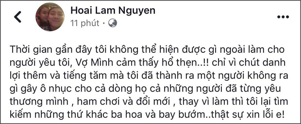 Cho đến mới đây, nam ca sĩ gây hoang mang khi viết một dòng trạng thái dài trên trang cá nhân để gửi lời xin lỗi với bà xã về những lỗi lầm trong quá khứ. Cụ thể, Hoài Lâm nghẹn ngào bày tỏ: "Thời gian gần đây tôi không thể hiện được gì ngoài làm cho người yêu tôi, vợ mình cảm thấy hổ thẹn, chỉ vì chút danh lợi thêm và tiếng tăm mà tôi đã thành ra một người không ra gì gây ô nhục cho cả dòng họ cả những người đã từng yêu thương mình, ham chơi và đổi mới, thay vì đi làm thì tôi lại tìm kiếm những thứ khác ba hoa và bay bướm, thật sự xin lỗi em!". Ngay lập tức dòng chia sẻ của Hoài Lâm nhận được nhiều lời an ủi và động viên đến từ bạn bè, người hâm mộ. Không ít người hoang mang không biết liệu gia đình nhỏ Hoài Lâm sắp có biến gì không.