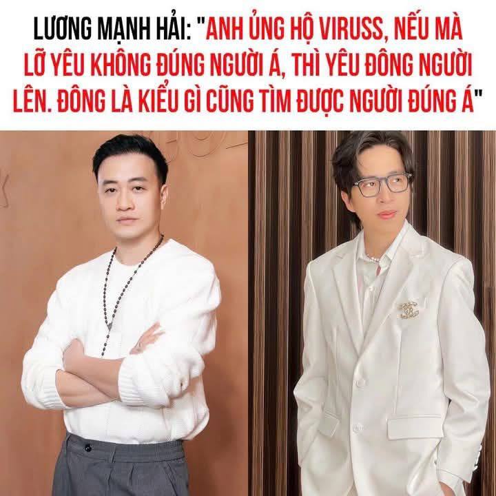 Mới đây, mạng xã hội xuất hiện hình ảnh được cho là chụp lại phát ngôn của Lương Mạnh Hải liên quan đến ViruSs. Cụ thể, bức ảnh lan truyền kèm câu nói chưa rõ thực hư: "Anh ủng hộ ViruSs, nếu mà lỡ yêu không đúng người á, thì yêu đông người lên. Đông là kiểu gì cũng tìm được người đúng á". Nhiều hội nhóm đồng loạt chia sẻ lại hình ảnh này, khiến tên tuổi Lương Mạnh Hải bất ngờ bị đặt vào giữa luồng tranh cãi xoay quanh phát ngôn tình cảm từng gây xôn xao của ViruSs.