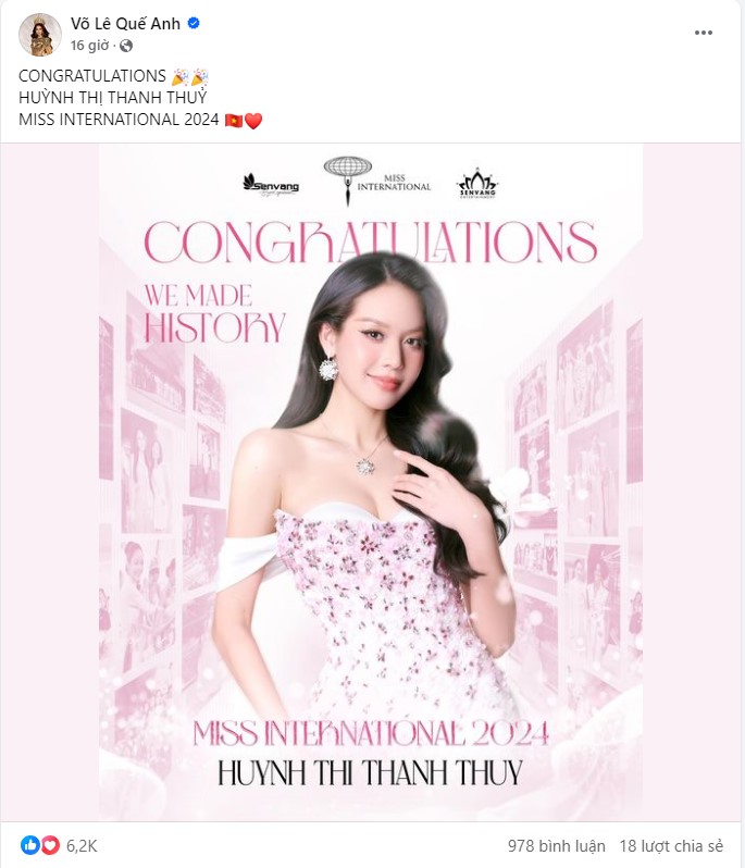 Giữa lúc trở thành tâm điểm bàn tán, Quế Anh không có phản hồi về động thái tắt tính năng bình luận trên TikTok của mình. Trên Facebook, nàng hậu vẫn đăng bài về Thanh Thủy và gửi lời chúc mừng về chiếc vương miện đầu tiên của Việt Nam ở Miss International.
