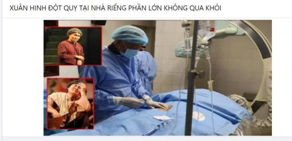 Mới đây, trên nhiều fanpage đã đăng thông tin nghệ sĩ Xuân Hinh qua đời do đột quỵ: "Sáng 25/10: Tin buồn NSND Xuân Hinh bị đột quỵ không qua khỏi ở tuổi 62 tuổi. Chia buồn cùng gia đình chú mong chú yên nghỉ. Tuổi thơ của chúng cháu rất vui khi được xem các Clip hài cuối tuần hài Tết của chú. Chúng cháu mãi nhớ chú". Thông tin này khiến người hâm mộ của danh hài Xuân Hinh hoang mang lo lắng.