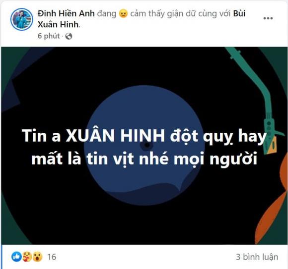 Mới đây, ca sĩ Đinh Hiền Anh - một đồng nghiệp, người em thân thiết của danh hài Xuân Hinh lên tiếng bức xúc với tin đồn này. "Tin anh Xuân Hinh đột quỵ hay mất là tin vịt nhé mọi người", Đinh Hiền Anh chia sẻ. Dưới bình luận, nhiều người bày tỏ sự bức xúc khi có tin đồn ác ý về nghệ sĩ Xuân Hinh.