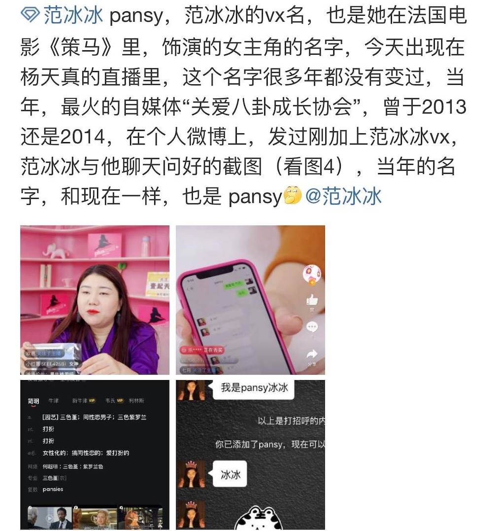 Phạm Băng Băng đặt tên tài khoản Wechat của mình là "pansy". Bên cạnh đó, theo tiết lộ từ fan hâm mộ, Phạm Băng Băng đã để tên này trong suốt nhiều năm, vào năm 2012-2013 thì cái tên này đã đại diện cho tài khoản của cô. Từ này trong tiếng Anh để nói về hoa cánh bướm, nhưng cũng có một ý nghĩa ẩn dụ khác nhằm ám chỉ là người đồng tính.