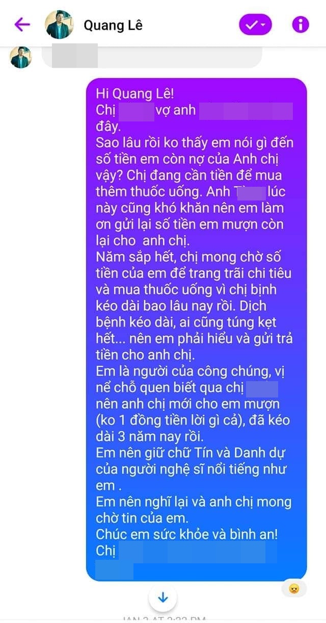 Cụ thể, người này tố Quang Lê mượn vợ chồng mình số tiền 4600 USD (hơn 106 triệu đồng) vào tháng 12/2018 tại Las Vegas (Mỹ). Mặc dù hứa sẽ trả tiền ngay khi về Việt Nam nhưng đến nay đã hơn 2 năm trôi qua mà nam ca sĩ không hề đả động đến việc trả nợ. Thậm chí người này còn nhắn tin nhiều lần qua Facebook cho Quang Lê nhưng đều không được hồi đáp.