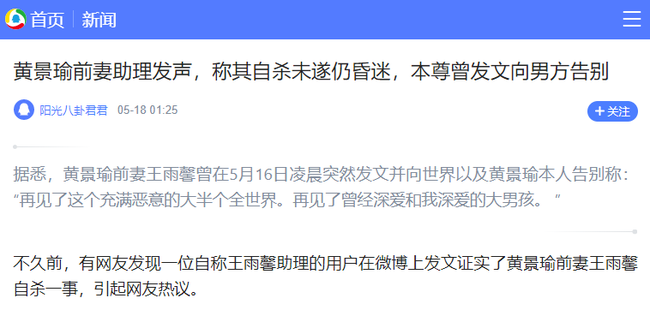 Giới truyền thông Hoa ngữ đưa tin, vào ngày 17/5 vừa qua, một số cư dân mạng phát hiện ra có người tự xưng là trợ lý của vợ cũ mỹ nam "Thượng Ẩn" Hoàng Cảnh Du đã đăng tải dòng trạng thái cho hay Vương Vũ Hinh tự tử nhưng may mắn được cứu sống.