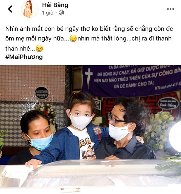 Đến chiều tối, con gái của cố diễn viên Mai Phương là bé Lavie cùng ông ngoại đã đến tang lễ của mẹ. Cô bé vẫn ngơ ngác chưa hề hay biết rằng mẹ của mình đã ra đi mãi mãi. Khoảnh khắc bé Lavie bên linh cữu khiến bạn bè nghệ sĩ, khán giả của cố nghệ sĩ Mai Phương không kìm được nước mắt. Ca sĩ Hải Băng chia sẻ: "Nhìn ánh mắt con bé ngây thơ không biết rằng sẽ chẳng còn được ôm mẹ mỗi ngày nữa mà thắt lòng".