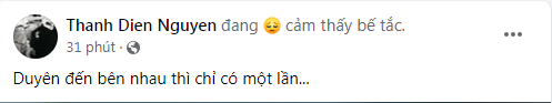 "Duyên đến bên nhau thì chỉ có một lần...", nghệ sĩ Thanh Điền viết. Chia sẻ của ông nhận được nhiều sự quan tâm của đồng nghiệp. Nhiều nghệ sĩ để lại bình luận động viên, an ủi mong tri kỷ của "cô Lan" sớm vượt qua biến cố.