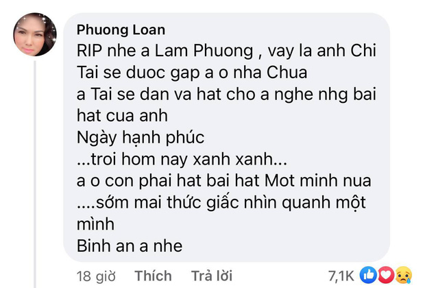 Đặc biệt, ca sĩ Phương Loan đã nén đau buồn để gửi lời tiễn biệt cố nhạc sĩ tài hoa. Dưới bài chia buồn trên trang Thuý Nga, ca sĩ Phương Loan để lại bình luận: "RIP nhé anh Lam Phương. Vậy là anh Chí Tài sẽ được gặp anh ở nhà chúa. Anh Tài sẽ đàn và hát cho anh nghe những bài hát của anh. Trời hôm nay xanh xanh, anh không còn phải hát bài Một Mình nữa. Sớm mai thức giấc nhìn quanh một mình. Bình an anh nhé!". Đây được coi là động thái đầu tiên trên MXH của vợ NS Chí Tài sau khi người chồng 33 năm gắn kết vĩnh viễn ra đi. Đọc những dòng tiễn biệt nhạc sĩ Lam Phương của ca sĩ Phương Loan, ai cũng rưng rưng vì quá xót xa.