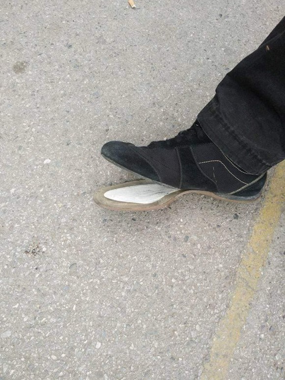 Trước, anh ấy có tặng tôi một đôi giầy da lộn rất đẹp. Tôi giữ mãi, chốt đến hôm đẹp trời mới mang ra đi. Đầy hào hứng, đầy tự hào, đầy tự tin... cho đến khi bước từ trong xe ra thấy vướng vướng dưới chân và đây là nó - trong ngày đầu được sử dụng. Hic. Còn chua chát nào hơn khi một nghệ sĩ đi dự sự kiện mà.... Giầy đi đế ở lại thế này".