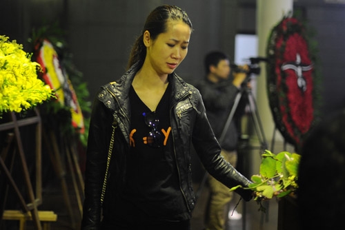 Người đẹp Dương Thuỳ Linh đau xót khi đi quanh linh cữu Trần Lập. |