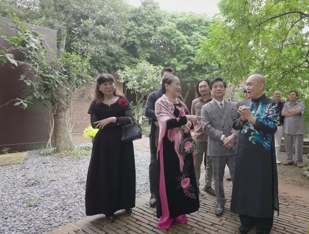 Nam nghệ sĩ dẫn mọi người đi từ cổng rộng lớn vào khuôn viên thênh thang, nơi bờ tường lắp tới 5 triệu viên ngói bằng tay, tới những bình vôi cổ nằm dưới chân cây trầu.