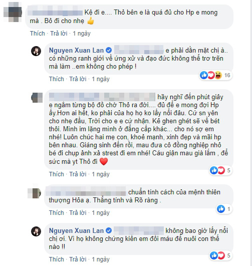 Và mới nhất, Xuân Lan đã lại có những dòng trạng thái được cho là nhắm tới người cũ: "Con là con của riêng mẹ! Con là tất cả của mẹ! Nên bất kỳ động thái nào tạo ý nghĩa rằng con đoàn tụ hạnh phúc với hình ảnh gia đình đầy đủ - mà không phải mẹ Lan đều không được phép diễn ra! Đời này con chỉ có một mẹ mà thôi!"