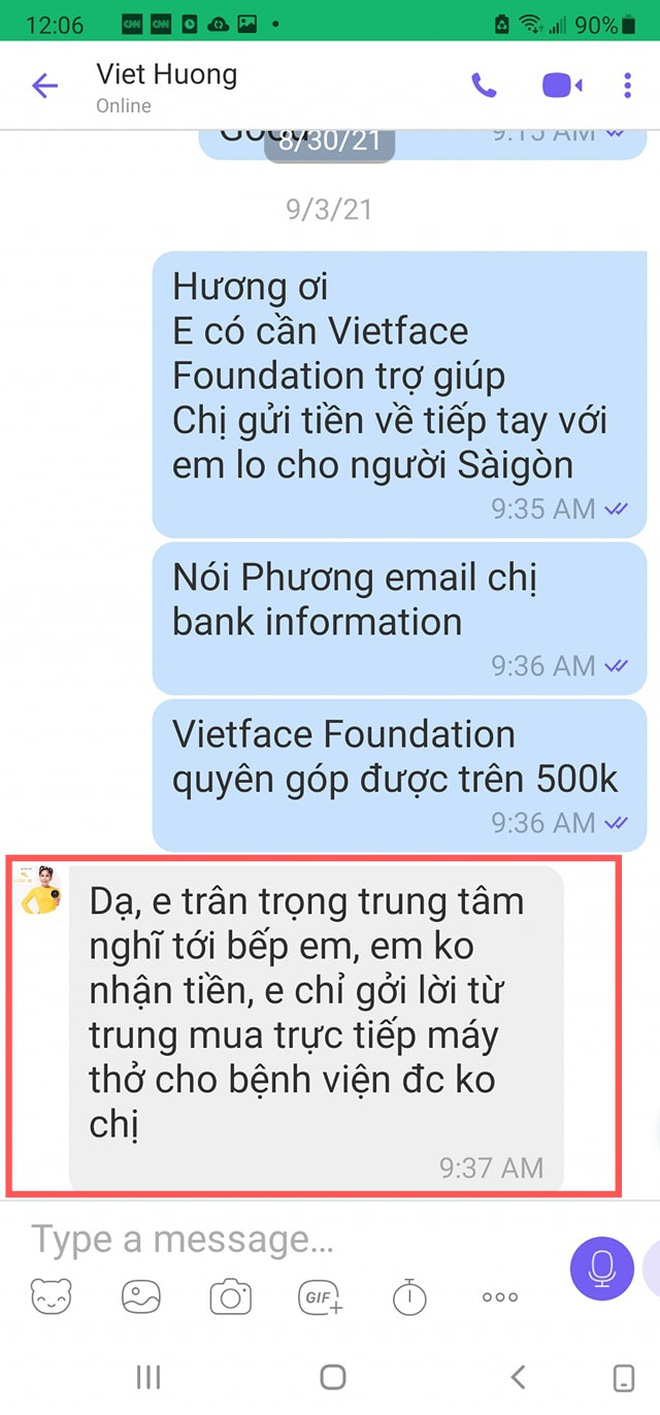 Giữa lúc thông tin trên đang rầm rộ, người trong cuộc đã lên tiếng làm rõ thực hư. Đại diện của tổ chức từ thiện tập hợp nhiều nghệ sĩ nổi tiếng ở Mỹ cho biết từng ngỏ ý gửi 1 phần trong số tiền 500.000 USD (tương đương 11,3 tỷ đồng) thu được sau 1 sự kiện về Việt Nam để cứu trợ nhưng Việt Hương quyết không nhận. Kèm theo đó, người đại diện này còn tung tin nhắn Việt Hương mong mạnh thường quân dùng số tiền trên để mua máy thở cho các bệnh viện tuyến đầu chống dịch: "Dạ, em trân trọng trung tâm nghĩ đến em. Em không nhận tiền. Em chỉ gửi lời nhờ trung tâm mua trực tiếp máy thở cho bệnh viện được không chị".