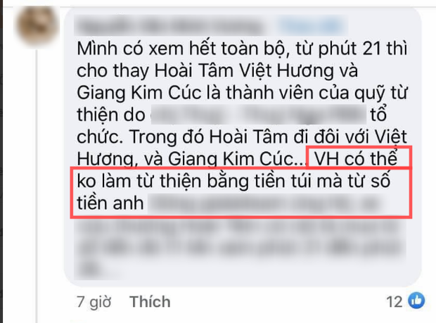 Về phía Việt Hương, cô liên tục khẳng định chỉ làm thiện nguyện bằng tiền túi trong suốt 3 tháng qua, đến ngày 15/9 tới sẽ dừng lại vì ekip đã quá sức. Trước đó, nữ danh hài chỉ công khai nhận 192 triệu từ Hoài Tâm để góp sức mua xe cứu thương phục vụ những người khó khăn.