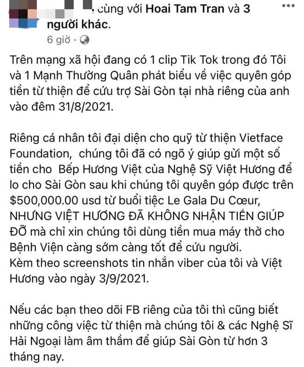 Được biết, vào giữa tháng 8, các nghệ sĩ ở Mỹ đã tổ chức sự kiện để gây quỹ hướng về TP.HCM. Sau khi thu về hơn 11 tỷ đồng, tổ chức từ thiện này đã mua máy thở, lương thực và hỗ trợ nhiều người dân tại TP.HCM.