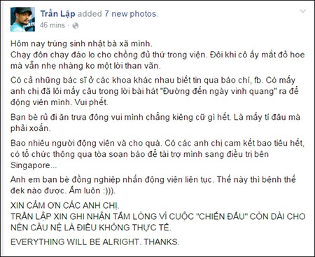 Chiều 5/11, Trần Lập đăng tải một số hình ảnh trong buổi đi khám ở bệnh viện cùng dòng trạng thái đầy cảm xúc gửi đến bạn bè và khán giả nhằm cảm ơn và trấn an tinh thần mọi người. Anh cho biết, hôm nay là sinh nhật bà xã mà vẫn nhìn thấy cô chạy đôn chạy đáo lo cho chồng đủ thứ trong bệnh viện. "Đôi khi đôi mắt cô ấy đỏ hoe mà vẫn nhẹ nhàng, không một lời than vãn".