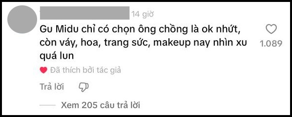 Trong đó một trong những ý kiến khiến cư dân mạng tranh cãi nhất hiện tại là gu của Midu. “Gu Midu chỉ có chọn ông chồng là ok nhất, còn váy, hoa, trang sức, makeup nay nhìn xu quá luôn” - bình luận này viết.