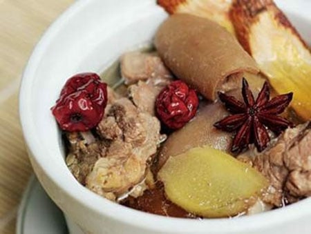 Thịt dê hầm táo đỏ: thịt dê 300g, táo đỏ 10 quả, hà thủ ô 40g, trần bì 4g. Hà thủ ô rửa sạch, cho vào siêu sắc thành thuốc, cô đặc còn 2 bát con nước thuốc. Thịt dê rửa sạch, thái miếng. Phi thơm tỏi và mỡ rồi cho thịt dê vào đảo tái, cho nước hà thủ ô vào thịt cùng với trần bì và táo đỏ. Hầm tới khi thịt chín nhừ là dùng được. Món ăn có tác dụng bổ thận, ích tinh, bổ trí não, cường gân cốt. Những người luôn cảm thấy mệt mỏi, hay bị rụng tóc, bạc tóc sớm, mất ngủ, chán nản chuyện ấy nên dùng.
