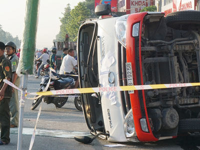 Vào cua ở ngã tư đường 10 giao Phù Nghĩa (TP Nam Định) chiếc xe container đánh lái bất ngờ đổ nghiêng, đè thẳng lên ôtô 5 chỗ chạy bên cạnh khiến cho lái xe và một nạn nhân nữ ngồi trong tử vong tại chỗ.