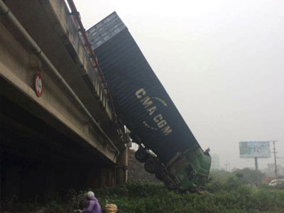Hiện trường 3 xe container đâm liên hoàn, cắm đầu xuống cầu Thanh Trì