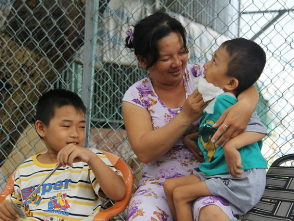 Hình ảnh người phụ nữ khoèo chân ngồi cạnh cổng chùa bón cơm cho 2 đứa con bệnh tật, phía trước đặt chiếc bàn xốp với tập vé số khiến ai ngang qua cũng xót xa.