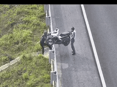 Đi vào đường cao tốc, hai nam thanh niên này đã gắng sức bê xe qua lan can để "đào tẩu", nhưng nỗ lực của họ không mang lại thành quả như ý.