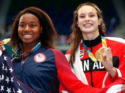 Simone Manuel (Mỹ) và Penny Oleksiak (Canada) cùng được trao HCV nội dung bơi 100 m tự do nữ tại Olympic 2016.