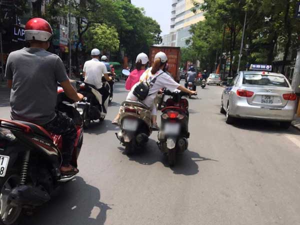 2 cô gái chở nhau trên đường phố Hà Nội đông đúc, cô ngồi sau nghiêng người, vươn 2 tay sang bên phải để dắt một xe máy khác.
