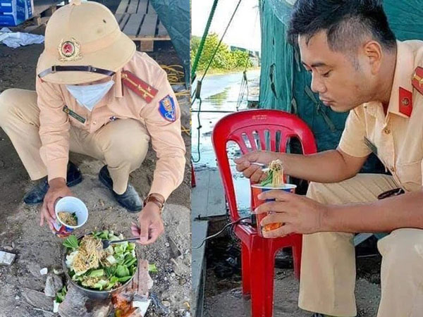 Bát mì trộn toàn rau của chiến sĩ CSGT cùng chiếc bếp tự chế tại chốt khiến nhiều người rưng rưng